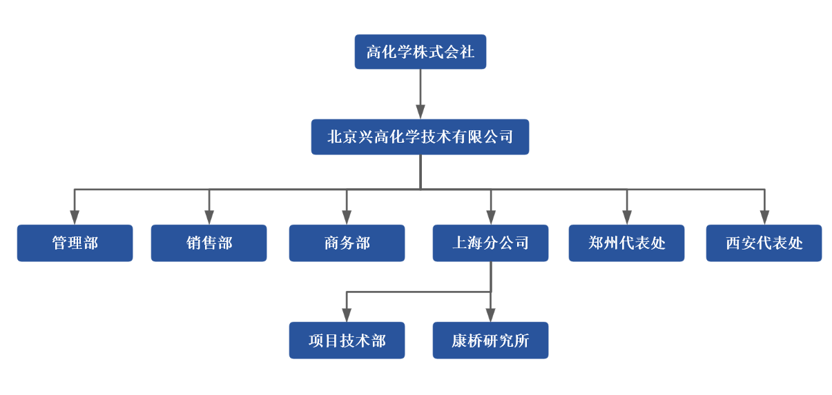 北京兴高化学技术有限公司是高化学株式会社在华的全资子公司,前身是高化学北京事务所,成立于2008年10月,并于2012年2月正式更名为北京兴高化学技术有限公司。公司专注于煤化工、石油化工、天然气化工等领域的技术推广,主要从事化工技术研发、技术许可、工程服务以及终端产品的代理销售,并提供配套的催化剂、专有设备等的营销与技术支持。公司目前拥有工业化的合成气制乙二醇(SEG®)技术,并代理二甲醚制丙烯(DTP)、聚丙烯、丁辛醇、丙烯酸、聚四氢呋喃等多项领先技术。