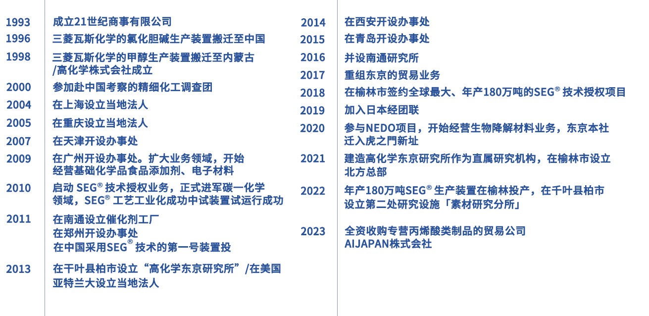 在高潮社长的领导下,高化学团队二十多年来致力于中日两国在化工领域的交流,涵盖化工技术研发、专利转让、化学品定制生产及国际贸易等各方面。高化学团队依托中国的化工产业发展,积极将国产化学品导入日本市场,使来自中国的MO气体、维生素C、异抗坏血酸纳、DMC等多种产品在日本市场占据了主导地位。